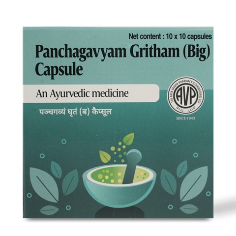 A cherished treasure from the ancient Ayurvedic treatises! AVP Panchagavyam Gritham (Big) Capsule is an exquisite blend of potent natural ingredients combined with the nourishing essence of the sacred Panchagavya to aid relief in a range of disorders.