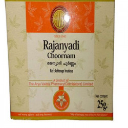 Description:Rajanyadi Choornam is an Ayurvedic medicine, in herbal powder form. It is used in children to treat diarrhea, fever, jaundice and anemia. Rajani means turmeric, which is the first ingredient of this medicine.