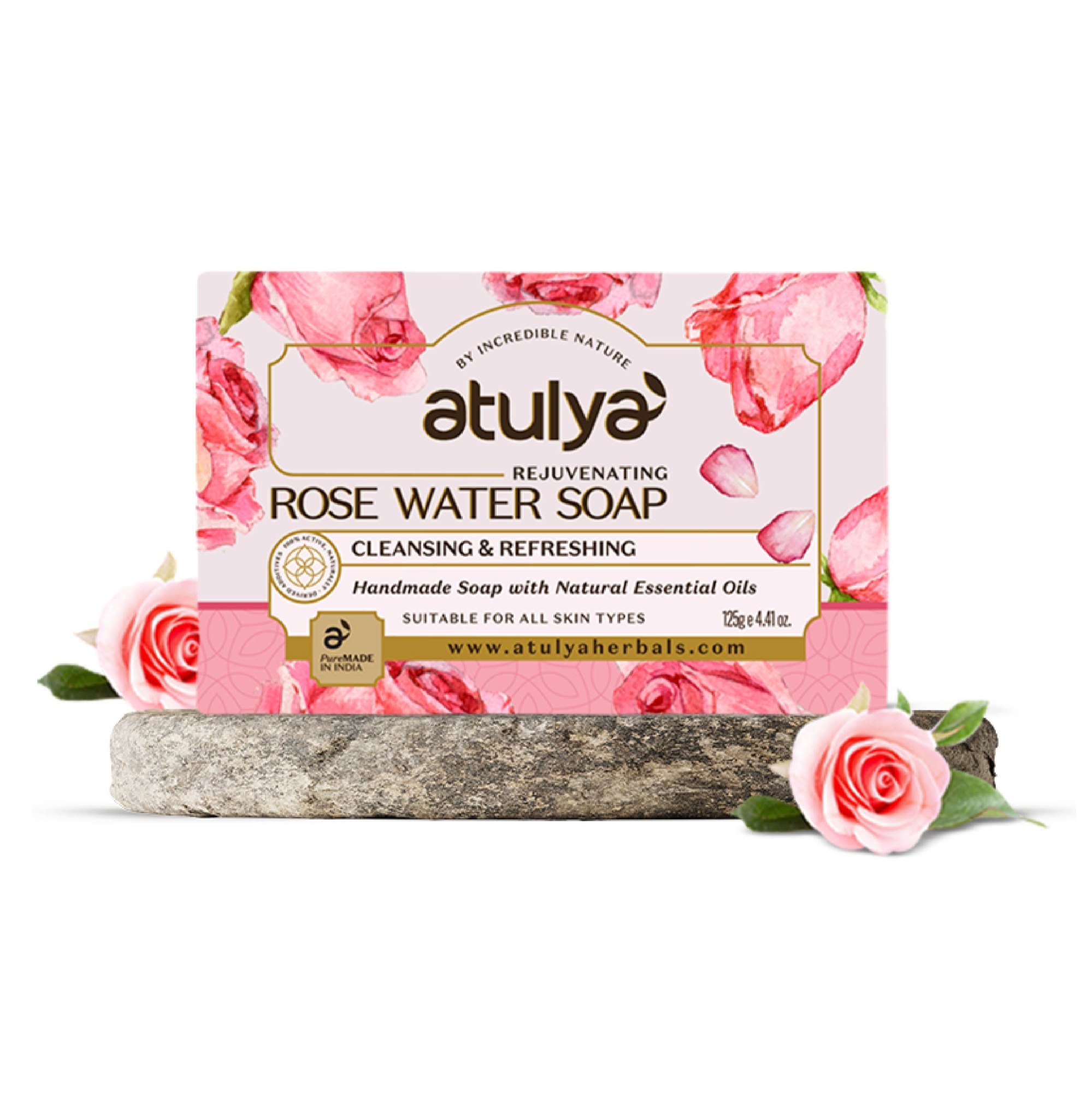 atulya Rose Water Soap is a natural skin toner and cleanser that deeply hydrates your skin, making it soft and supple. It has a soothing fragrance that revitalizes your mind and acts as a cooling agent for calming skin irritation and inflammation. This natural handmade soap helps moisturize your skin, tighten pores, reduce blemishes, and fight early signs of aging.