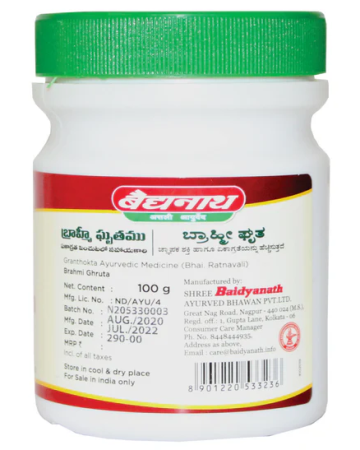 Baidyanath (Nagpur) Brahmi Ghruta benefits the brain by nourishing it and stimulating healthy brain functions. It contains brahmi, which boosts cognitive abilities and stimulates the brain, enhancing memory and concentration. It also has shankhpushpi, which aids memory enhancement, retention, and maintaining focus while working.