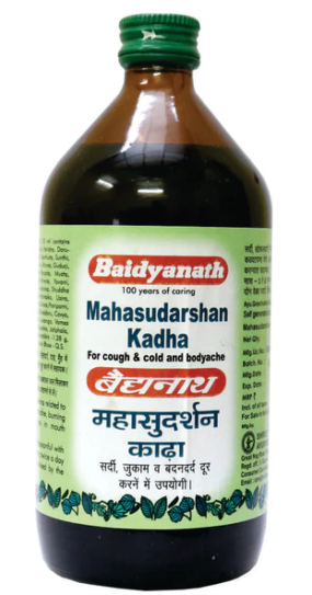 Mahasudarshan Kadha is an Ayurvedic medicine formulated with decoction of 52 herbs having antibacterial, antimicrobial and antiviral properties. It has Tridosha Shamak action, so it balances Vata, Pitta and Kapha Dosha. It induces detoxification by digesting AMA (toxin particles developed from undigested food) and clearing the blockage of microchannels in the body which induces sweating. Triple action formula helps to relieve cough, cold and body ache.