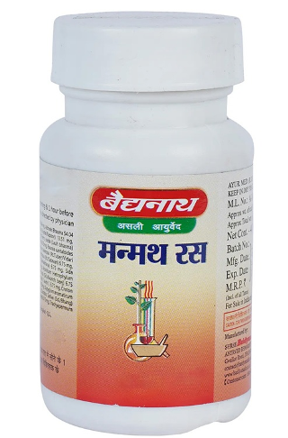 Manmath Ras Tablet from Baidyanath contains Abhrak Bhasma, Shuddha Parad, Shuddha Gandhak, Shuddha Karpoor, Vang Bhasma, Banga Bhasma, Tamra Bhasma, and Loh Bhasma. Shuddha Parad and Shuddha Gandhak are combined together to form Kajjali.