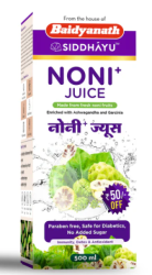 Made from fresh Noni fruits(Enriched with Ashwagandha and Garcinia) Immunity, Detox & Antioxidant. Baidyanath Noni+ juice is crafted from the fresh noni fruits of the Morinda citrifolia plant renowned for its antioxidant, detoxifying, anti-inflammatory, pain relieving, immune stimulant and antibacterial properties. It is a good source of vitamin C, B, essential minerals and macronutrients. Our revitalizing Noni+ Juice is enhanced with the goodness of Ashwagandha and Garcinia. in weight management. A potent fusion of carefully selected ingredients, our premium Noni+ Juice blend is expertly crafted to nourish your body, uplift your spirit and elevate your wellness journey naturally.