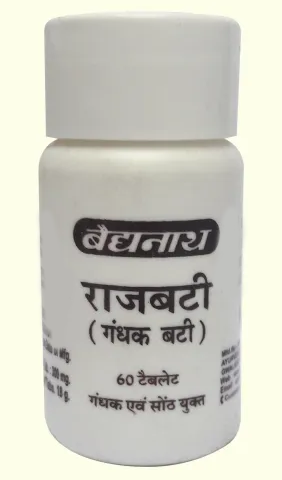 Baidyanath (Jhansi) Rajbati (Gandhak Bati) is an ayurvedic medicine that is primarily used for the treatment of stomach disease. The key ingredients of Baidyanath Rajbati (Gandhak Bati) are ginger, shuddha gandhak and lemon. The correct dosage of Baidyanath Rajbati (Gandhak Bati) depends on the patient's age, gender, and medical history.