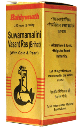 Suwarnamalini Vasant Ras is a time-tested Ayurvedic medicine enriched with gold and pearl, known for its natural immunity enhancer and antibiotic activity. It helps to alleviate weakness and provides strength to the body.