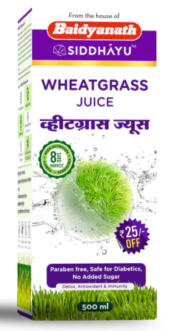 Baidyanath Wheatgrass Juice, meticulously crafted from leaves harvested on the 8th day for peak freshness and nutrient density. Wheatgrass is known for its immunity boosting, digestive, pitta and kapha dosha balancing and nourishing properties. Our wheatgrass juice isn't just a nutritional powerhouse; it's a symphony of vitamins and minerals, that will strengthen your immune system, detoxify your body, promote radiant skin, and sustain energy throughout your day. A wholesome juice straight from nature's bounty to your bottle. Embrace vitality and support overall well-being with every sip!