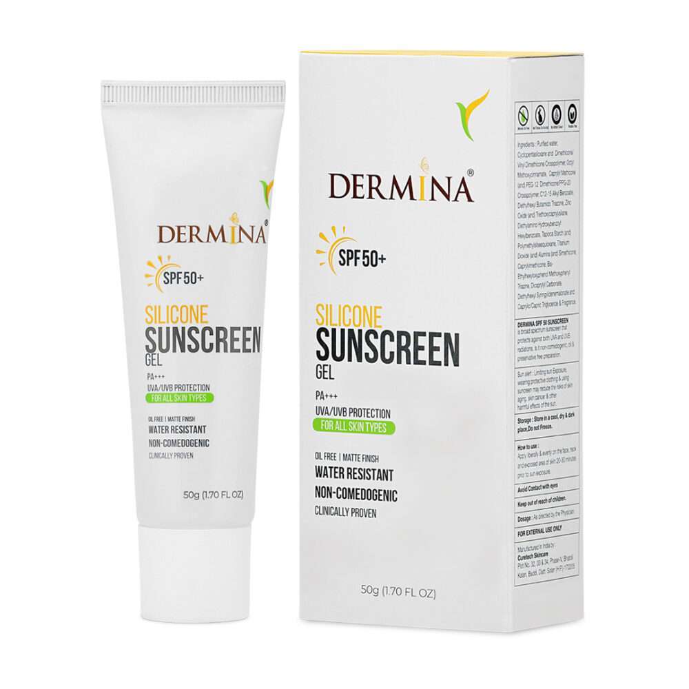 Dermina’s silicone-based sun protection is a topical product that typically works to protect the skin by absorbing harmful rays emitted by the sun. Its effective formulation contains active ingredients that provide different levels of protection against both, UVA and UVB rays. Dermina’s Silicone Sunscreen Gel with SPF 50 is made with skin-approved ingredients that are known to enhance the texture, protect and repair sun damage. Used as the last step in the AM routine, Dermina’s sunscreen with SPF 50 works tirelessly to protect and repair, delay premature aging, and maintain skin cells.