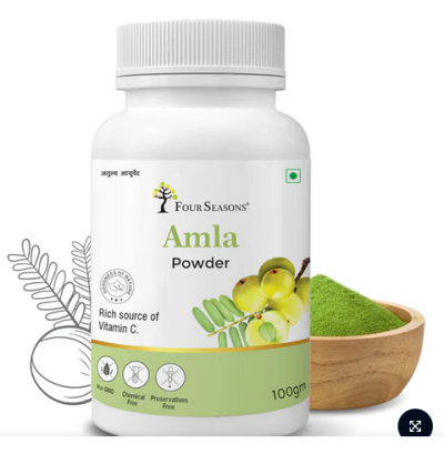 Four Seasons Amla Powder is a herbal powder formulated to relieve symptoms of chronic diseases like diabetes, mental illnesses, and various inflammations. Amla is well known for its antibacterial, antioxidant, and expectorant qualities. It purifies blood and acts as a remedy for hair loss. When taken for internal use it enhances appetite, purifies the blood, treats ulcers, and improves the immune system. Four Seasons Amla Powder helps in treating digestive disorders. Amla helps in boosting immunity. It also helps in reducing the risk of heart related diseases by regulating bad cholesterol on our body.