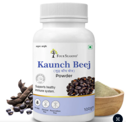 Four Seasons Kaunch Beej Powder works as a natural supplement that revitalizes and re-energizes the coitus process in humans. It helps in promoting reproductive health. Four Seasons Kaunch Beej Powder helps boost immunity, strength and metabolism. It also supports sexual health. Kaunch Beej Powder helps in the management of nervous disorders like Parkinson's disease and also helps manage the symptoms of arthritis. Four Seasons Kaunch Beej Powder It is a dietary supplement formulated with kaunch beej powder that helps improve overall health and wellness. It is a natural and herbal energy booster that helps improve stamina, vitality and vigour. It helps to strengthen bones and muscles and reduce fatigue.