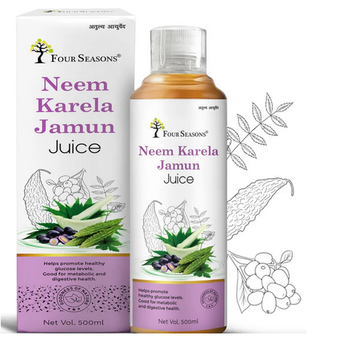 Four Seasons Neem Karela Jamun Juice combines the health benefits of Jamun and Karela Fruits with Neem leaves to help keep up healthy levels of blood sugar. It is an immunity booster which helps promote healthy glucose levels. Neem Karela Jamun is well known Ayurvedic herb to regulate blood sugar level. Rich in phyto-nutrients like minerals, vitamins and antioxidants. With Low calories, this juice has various minerals that are beneficial for digestion and has anti- ageing properties. It not just helps boost the metabolism, but also aids for a healthy weight and is good for your digestive system.