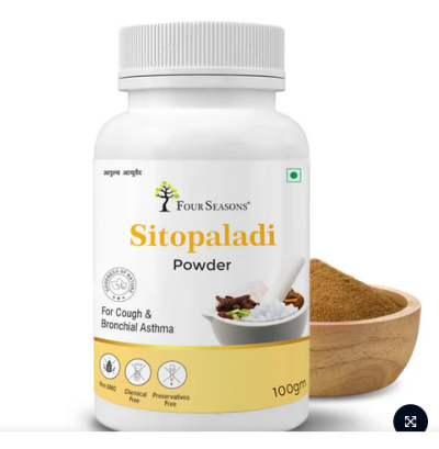 Four Seasons Sitopaladi Powder is a mixture of traditional herbs that may help boost the immune system and promote health and wellbeing. It supports healthy lungs. It is a balanced formula and is considered to be useful for Kapha imbalances. It has potent anti-inflammatory and antioxidant properties. Four Seasons Sitopaladi Powder is the ultimate fitness supplement. It is an product made from herbs that combine to produce a rejuvenating, energising, detoxifying and stimulating effect.