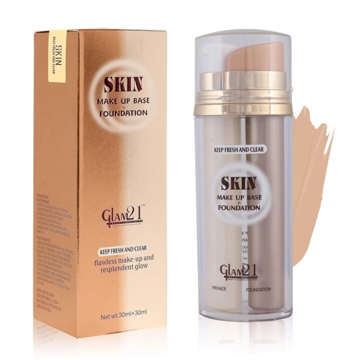 Glam 21 is pleased to announce the all-new SKIN Make Up Base + Foundation. Our unique combination of primer and foundation is equipped with a satin-smooth creamy texture to moisturize your skiṇ. The primer diminishes fine lines, pores and creates a perfect base for your makeup. The matte finish foundation blends seamlessly with your skin and lasts all day long..