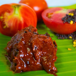The tomato pickle from Andhra is most liked and looks amazing with that deep ready colour and with some garlic as bonus flavour adding. It can be eaten with just plain boiled rice. Ingredients: Tomato, Garlic, Oil, Turmeric Powder, Red chilli powder, Mustard seeds, Fenugreek seeds, Asafetida, Salt,Tamarind ShelfLife: 90 days