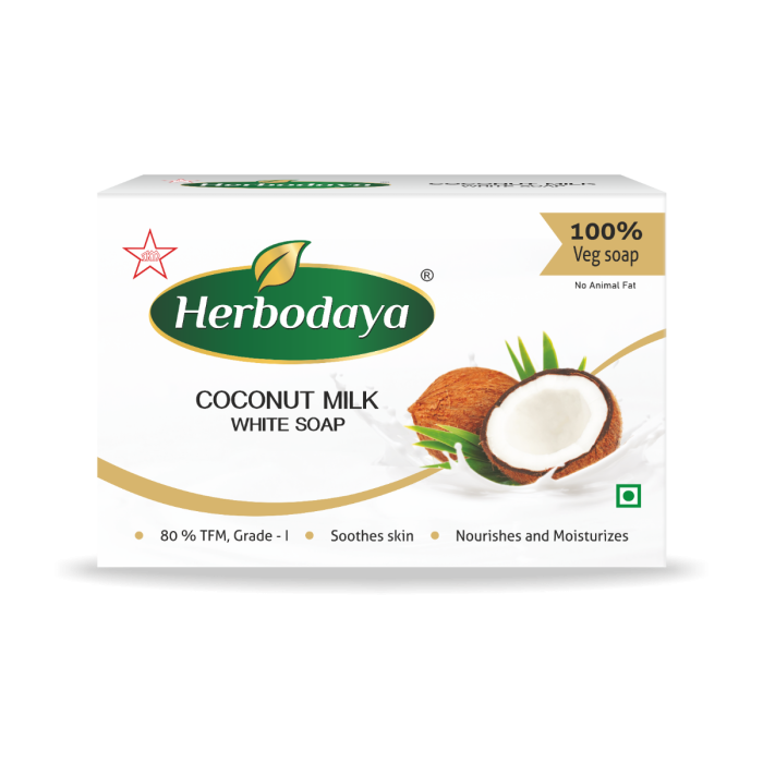 Herbodaya Coconut Milk White Soap:Grade 1 soap100 % veg soapFree from animal fatAids skin whiteningPossesses anti-aging propertiesNourishes and moisturizes skinProtects skin from suntanReduces wrinkles and gives a natural glow