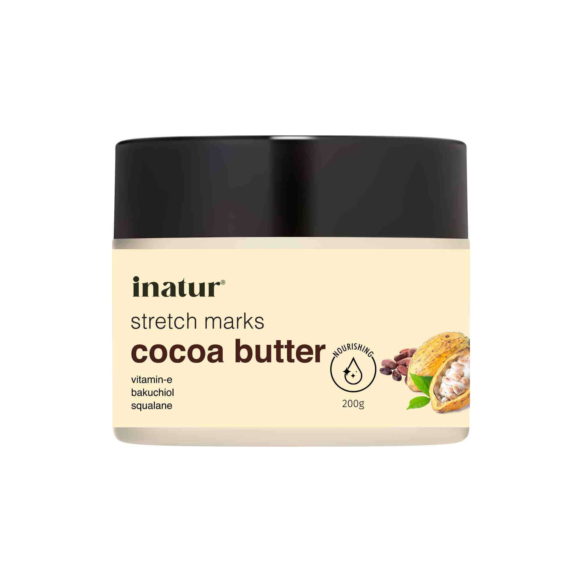 inatur Cocoa Butter is a remarkable product carefully crafted to combat stretch marks and nourish your skin. With its potent blend of natural ingredients, including cocoa butter, Bakuchiol, Vitamin E, and Squalane, this vegan and natural formulation offers a host of benefits. Let's explore why cocoa butter and these active ingredients make inatur Stretch Marks Cocoa Butter a must-have for anyone seeking healthy and beautiful skin.
