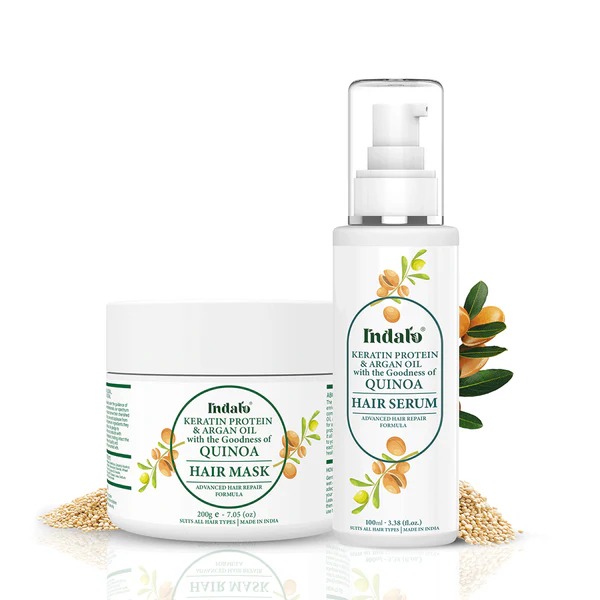 Make your hair shiny, smooth, and soft by using this Indalo Keratin Repair Kit that includes Quinoa Hair Mask and Keratin Quinoa Protein Hair Serum. With the goodness of quinoa, argan oil, and keratin protein, both these products in this kit add great nourishment to your hair and make them silky, healthy, and frizz-free.
