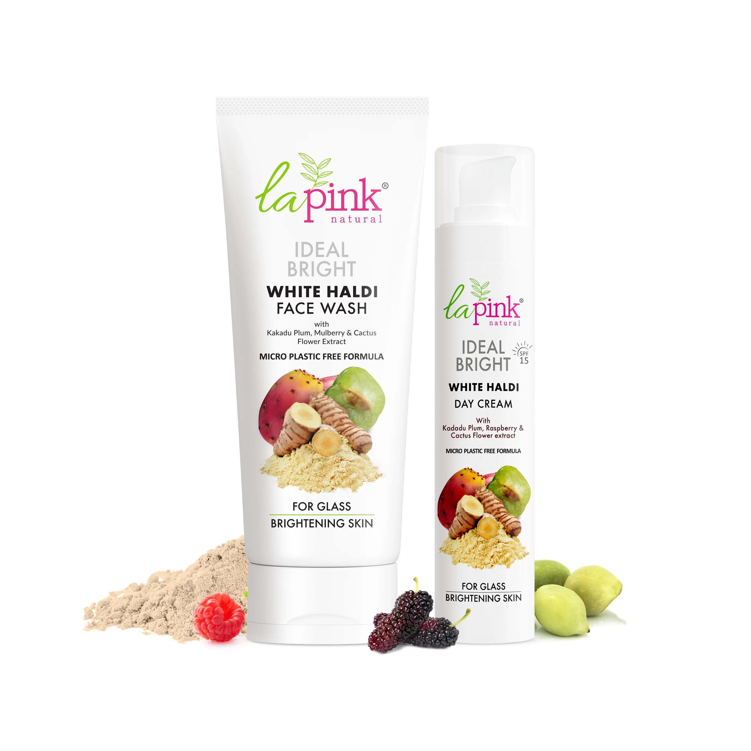 Enhances Glass-like, brightened, and lightened skin: The Ideal Bright Face Wash enhances its natural brightness, giving it a glass-like, brightening effect. The Day Cream complements this by enhancing the skin's brightness and lightening dark spots, resulting in a more even skin tone and a radiant complexion.