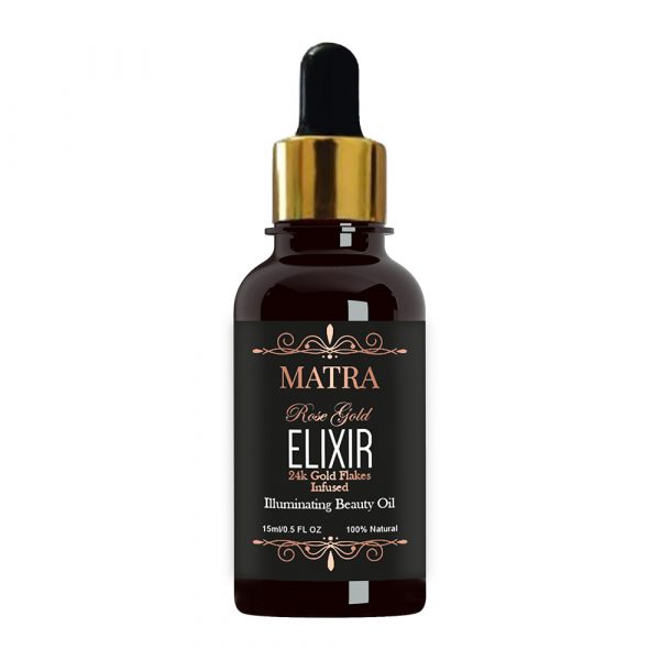 It’s time to give your skin that royal treatment with 24k gold flakes infused in Matra’s Rose Gold serum. This illuminating beauty oil is climbing the ladder of fame in the skincare industry for the amazing benefits it renders to the skin. It helps enhance overall complexion, decreases depletion of collagen, increases skin elasticity, treats tan, reverses pollution and UV damage. It softens skin and gives it a gold like radiance making it soft, supple and glossy.