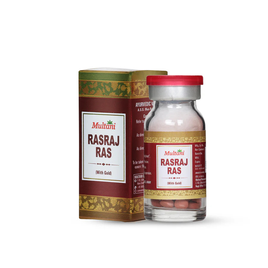 Multani Rasraj Ras with Gold is a premium Ayurvedic formulation designed to enhance overall strength, vitality, and neurological health. This powerful herbal-mineral combination is enriched with Swarna Bhasma (Gold), which is known for its rejuvenating and strengthening properties. It is widely used in Ayurveda to support the nervous system, improve muscle strength, and boost general well-being.
