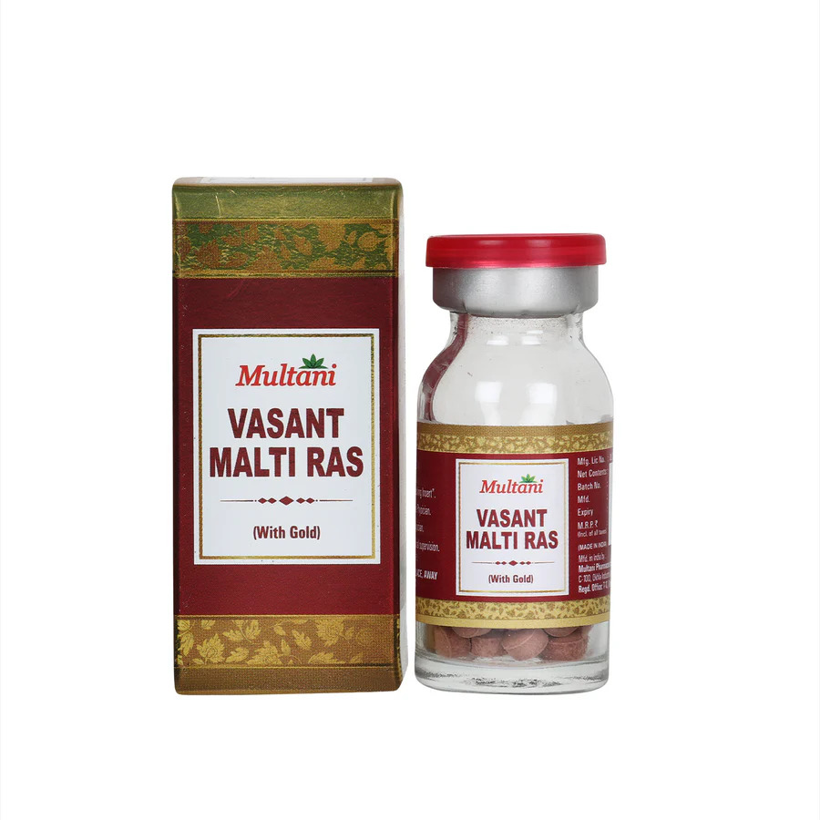 "Multani Vasant Malti Ras with Gold is a renowned Ayurvedic formulation enriched with Swarna Bhasma (Gold Ash) and other powerful herbs and minerals. It is widely used in Ayurveda to boost immunity, enhance energy levels, and support overall health. This potent Rasayana is beneficial in managing chronic diseases, respiratory disorders, and general debility.