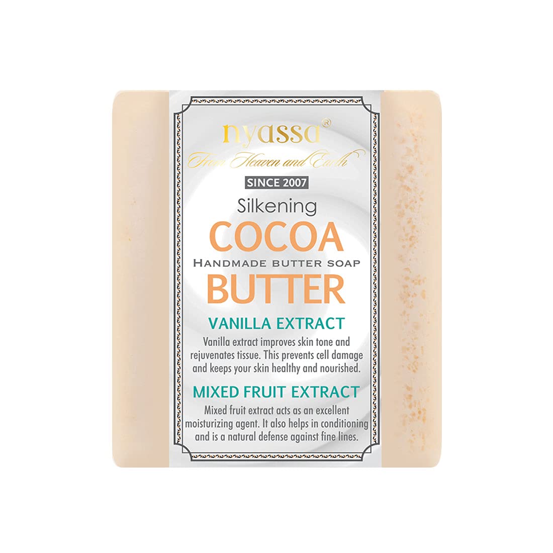 This bar of soap could pass off as any Indian milk sweet. With real cashews, figs and almonds in the soap, it is difficult to keep your hands off this bar. A must have for individuals who love gourmand flavors in their bath and body products. A sweet, delicious bar of soap. The Handmade Cocoa Butter Soap from Nyassa features Vanilla Extracts and Mixed Fruit Extracts to aid skin rejuvenation, improve skin tone and keep your skin nourished. The ultimate moisturiser, Cocoa Butter keeps skin soft and supple and is perfect for treating extremely dry skin. A product of heaven and earth, each element in this handmade bath soap promotes healthy skin that glows with sheer radiance.