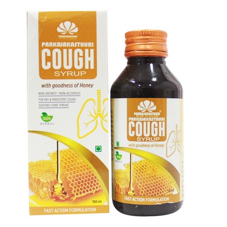 Pankajakasthuri Cough Syrup with Honey, a blend of 100% herbal ingredients with goodness of Honey is useful in relieving Dry and Persistent Cough.