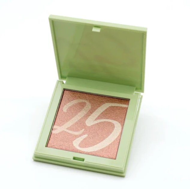 • Gold foil commemorative "25" on top of the compact featuring both a blush & highlighter.