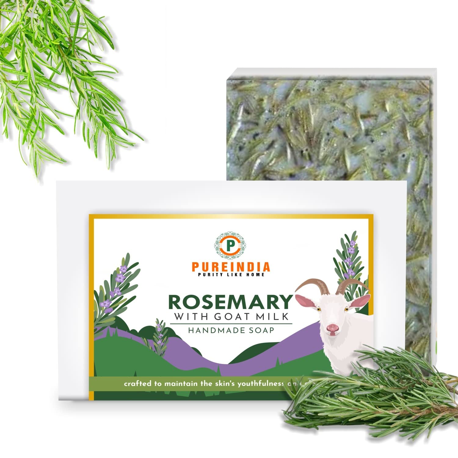 Pureindia Handmade Rosemary Soap is Carefully crafted. Extracted from naturally occurring, known for its absorbent, purifying and skin calming properties. Rosemary is effective in promoting healthy skin by soothing and healing a wide range of skin issues.