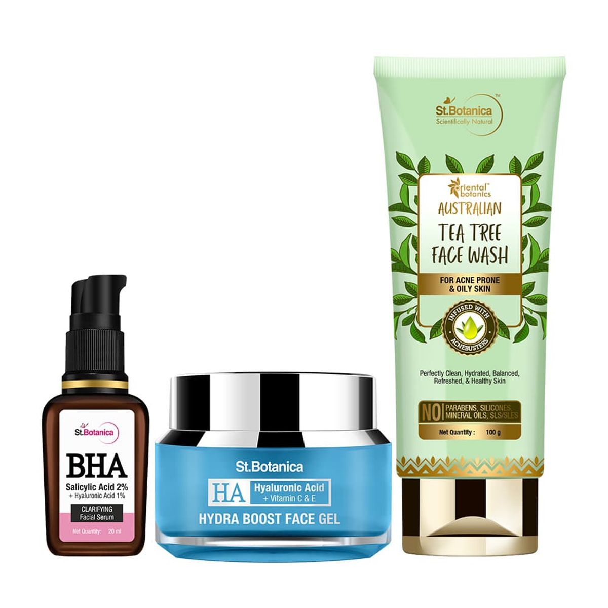 An anti-acne trio with three potent formulas. This kit contains Australian Tea Tree Anti-acne Face Wash, BHA Skin Clarifying Face Serum & Hyaluronic Acid Face Gel.