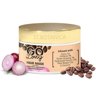 Our Hair Mask is a combination of the essential ingredients that add deep hydration to your hair and scalp. Onion Oil is rich in sulphur that helps strengthen hair strands. 1% Caffeine penetrates the hair follicles and strengthens hair roots as well as the hair shafts. 1% Panax Ginseng helps nourish the roots & lengthen hair. 2% Hydrolyzed Keratin restores damaged hair & makes them stronger. Goodness of other ingredients such as Vitamin B5, Shea Butter, Jojoba Oil, Avocado & other help make your hair long & flaunt worthy. Revive your weak hair strands & strengthen your roots with St.Botanica GO Long Hair Mask. It is a nourishing Hair Mask that deeply hydrates & conditions the hair, leaving you with caress-worth
