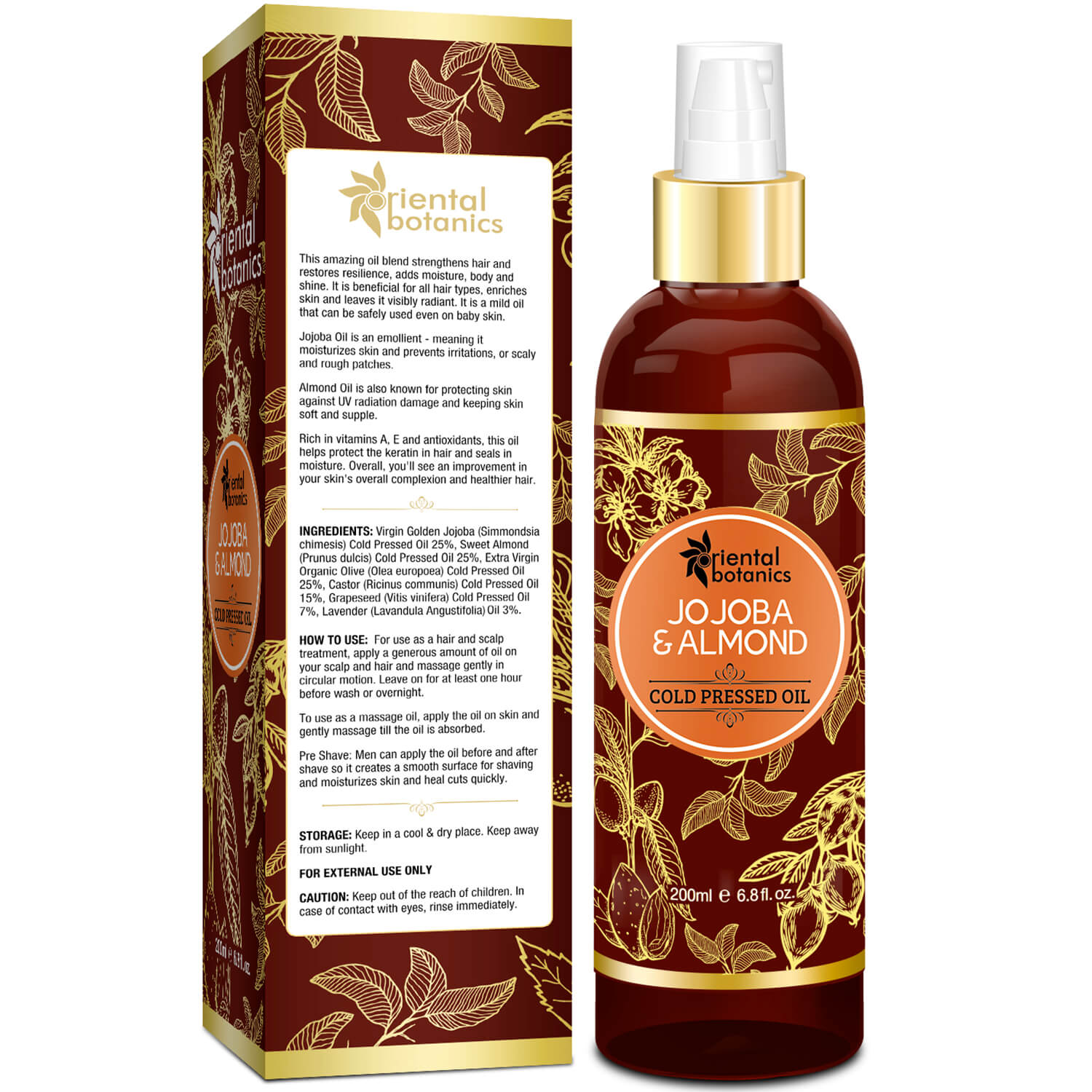This oil is a concoction of premium natural oils that are legendary for their beneficial effects on the skin and hair. Packed with skin-friendly fats and vitamins, it helps provide superior nourishment to your skin and hair. The fast-absorbing oil leaves a transparent film of oil on the skin and helps seal moisture into the skin so that your skin retains its natural suppleness for a longer time without feeling greasy. The protective barrier also helps defend the skin from environmental damage and preserves the skins youthful elasticity. Oiling the hair helps smoothen the frizzes and reduces tangles and breakages. It also helps minimize scalp flaking and nourishes the hair follicles, thereby decreasing excessive hair fall and encouraging healthy hair growth. This oil is free from mineral oil and toxic compounds such as paraben, phthalate, silicone, and sulfate. This 100% natural product that suits all skin and hair types. It has not been tested on animals. Oriental Botanics is a PETA-certified cruelty-free brand.