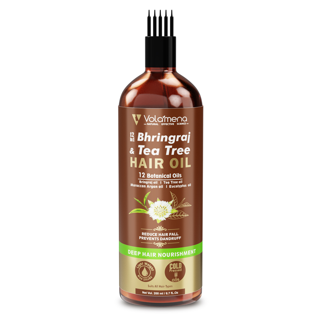 Volamena 12 in 1 Bhringraj & Tea Tree oil is formulated with 12 precisely selected Botanical Cold Pressed oils & Essential oils, to strengthen your hair, reduce hair-fall & offer deep nourishment.
