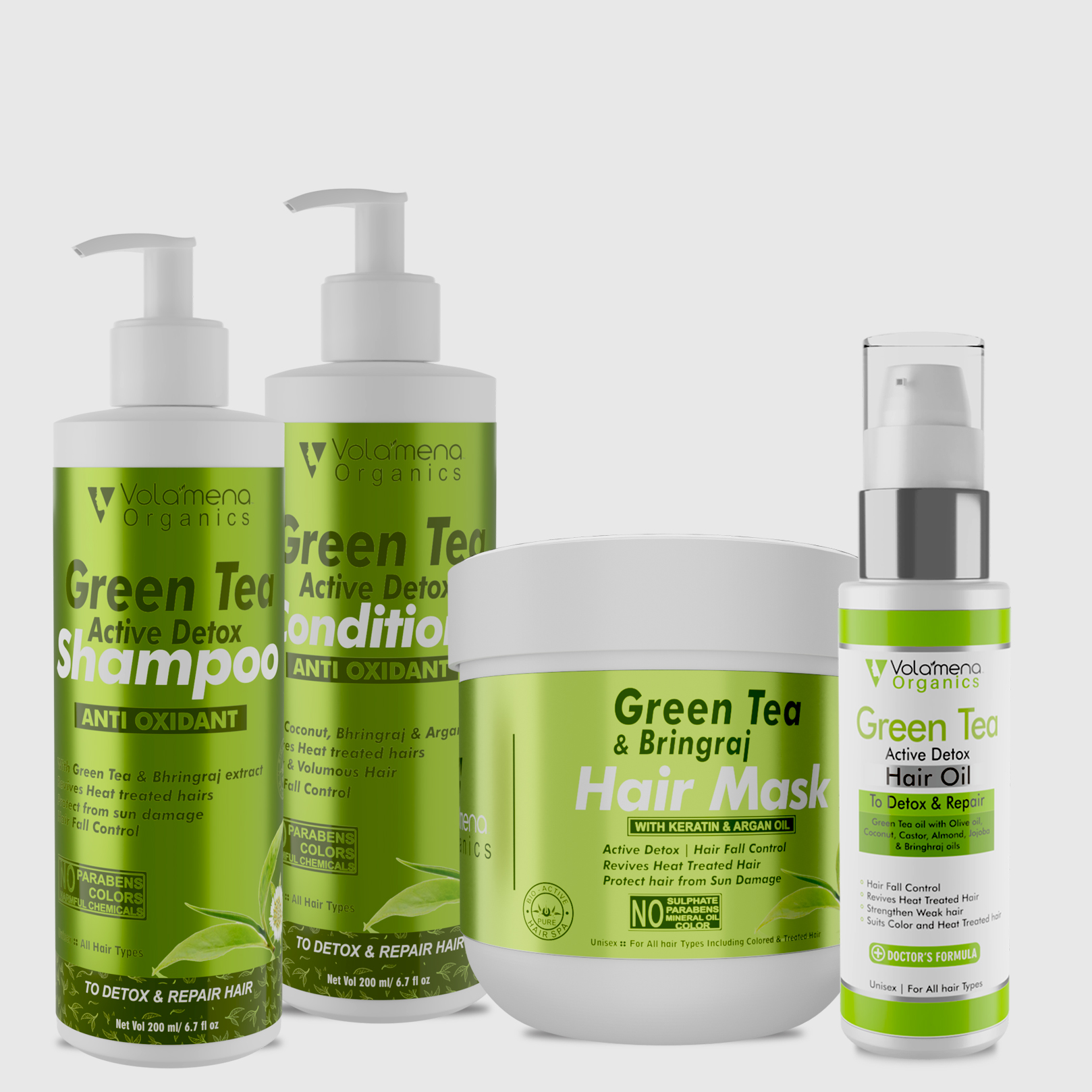 Volamena Green Tea Complete Hair Detox & Repair Kit Pack includes 4 amazing products Green Tea Oil, Green Hair mask, Onion Shampoo & Conditioner